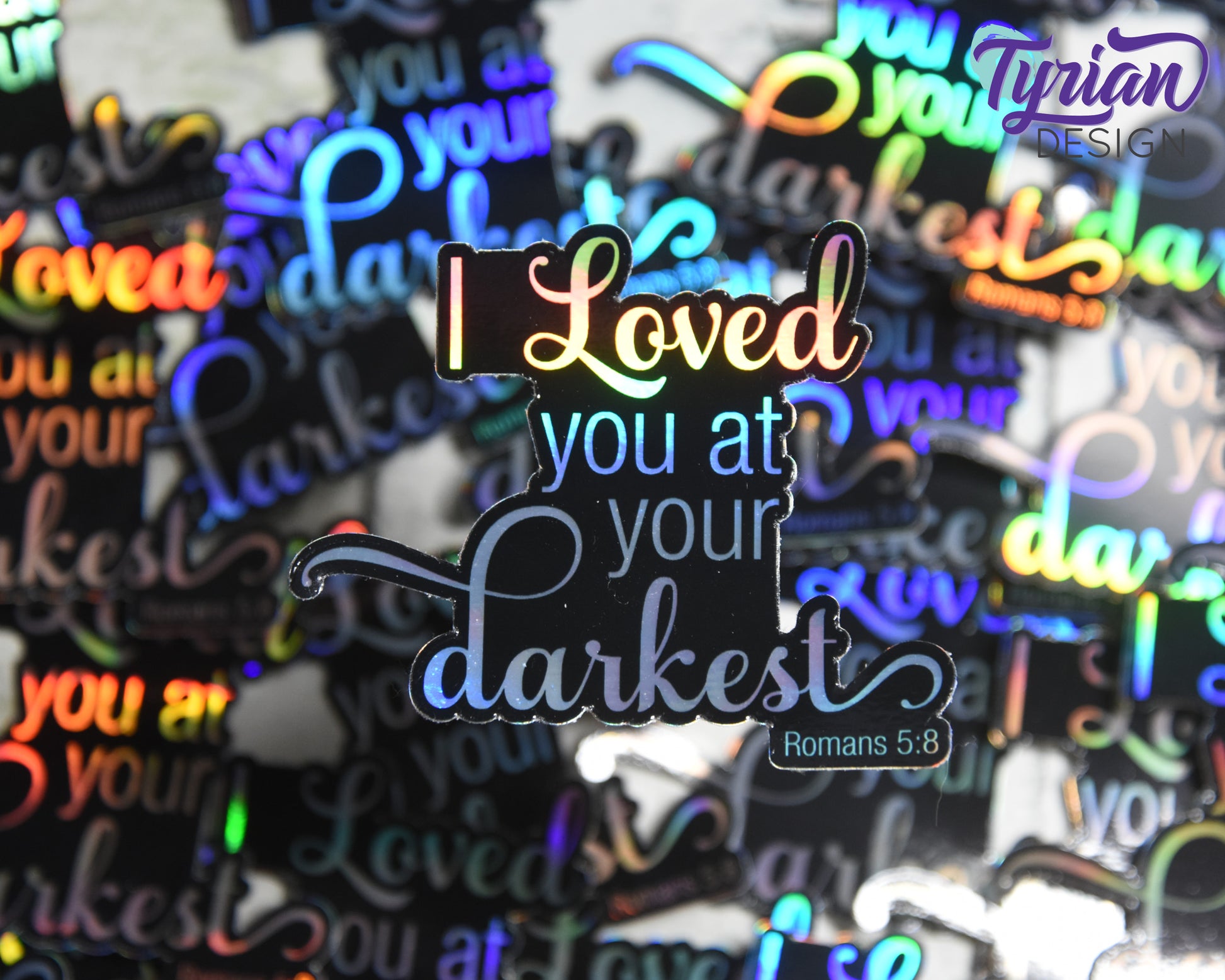 Holographic - I loved you at your darkest | Romans 5:8 Vinyl Sticker, high quality weather proof vinyl. 3 inch Bible verse